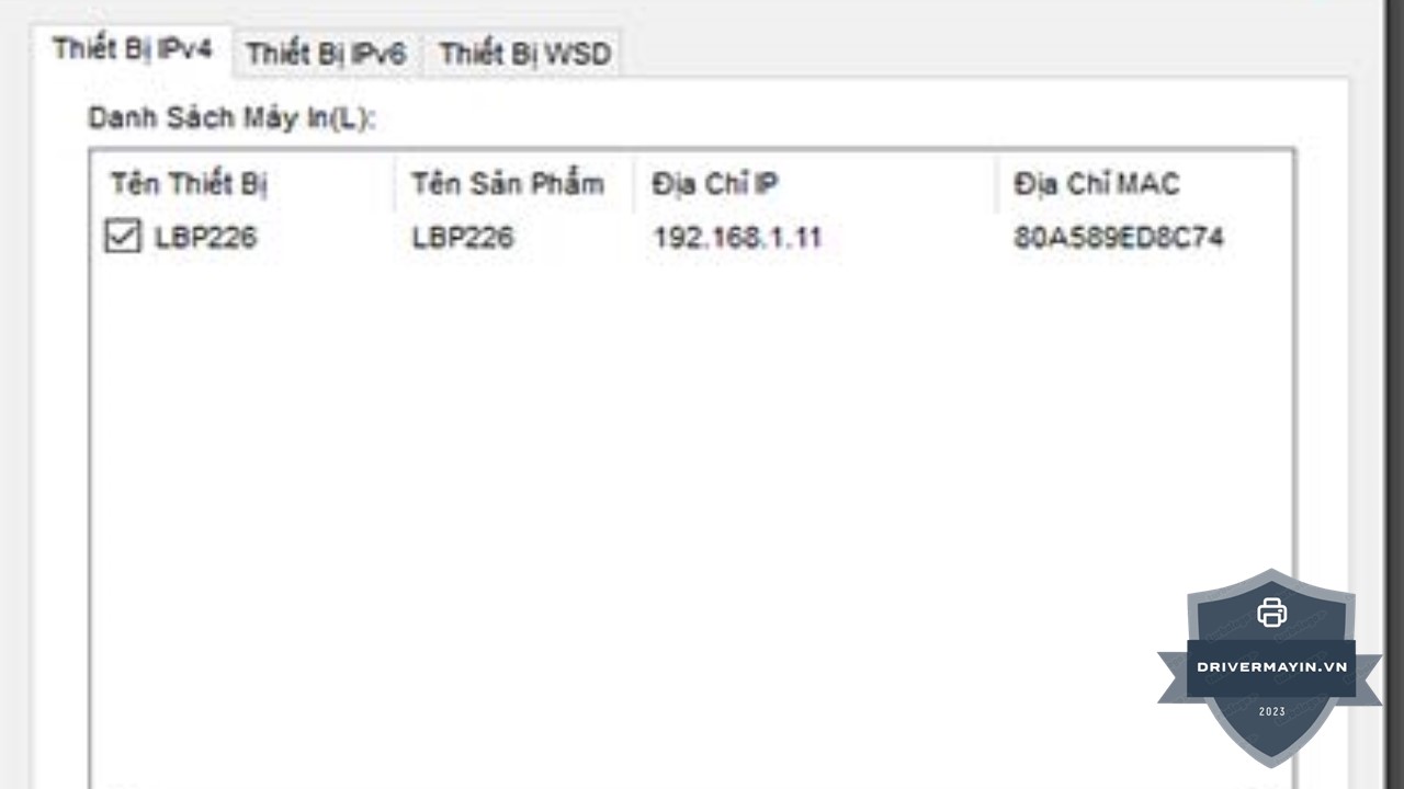Hệ thống sẽ quét và hiển thị danh sách máy in (kèm địa chỉ IP/MAC nếu in qua mạng)