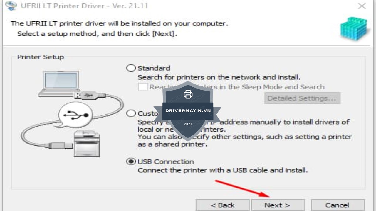 Tại bước này, bạn chọn Install with USB Connection nếu đang kết nối máy in với máy tính bằng cáp USB. Sau đó nhấn Next để tiếp tục quá trình cài đặt driver.