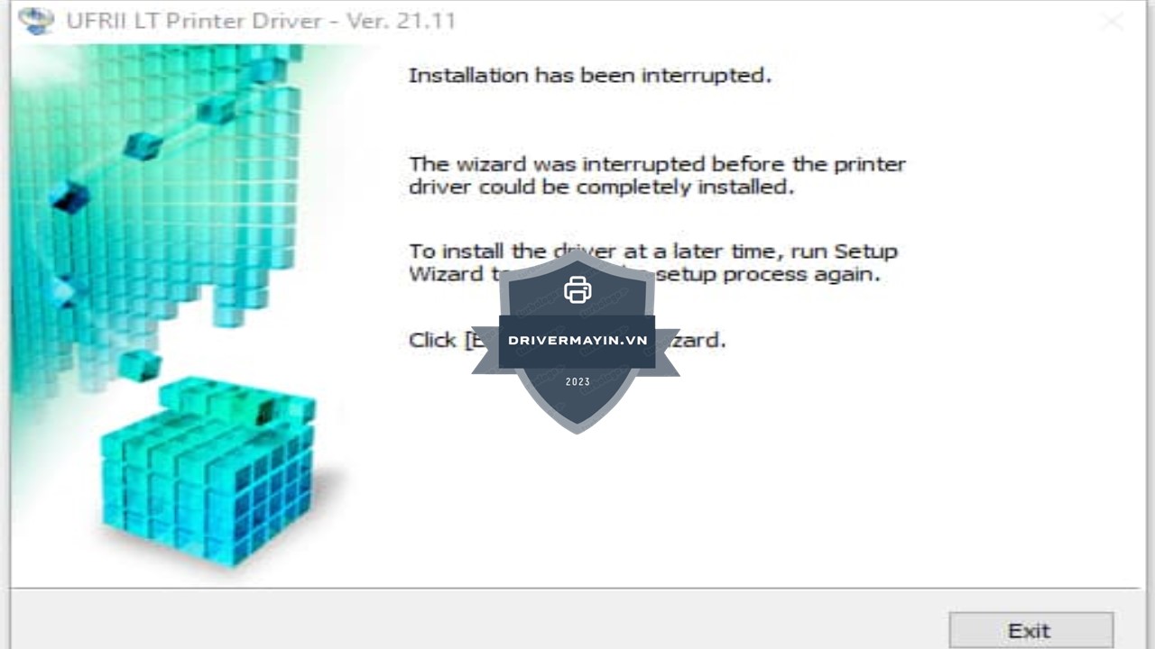 Khi cài đặt kết thúc, nhấn Exit để đóng cửa sổ chương trình. Nếu hệ thống yêu cầu, bạn nên khởi động lại máy tính để đảm bảo driver hoạt động ổn định và máy in sẵn sàng sử dụng.