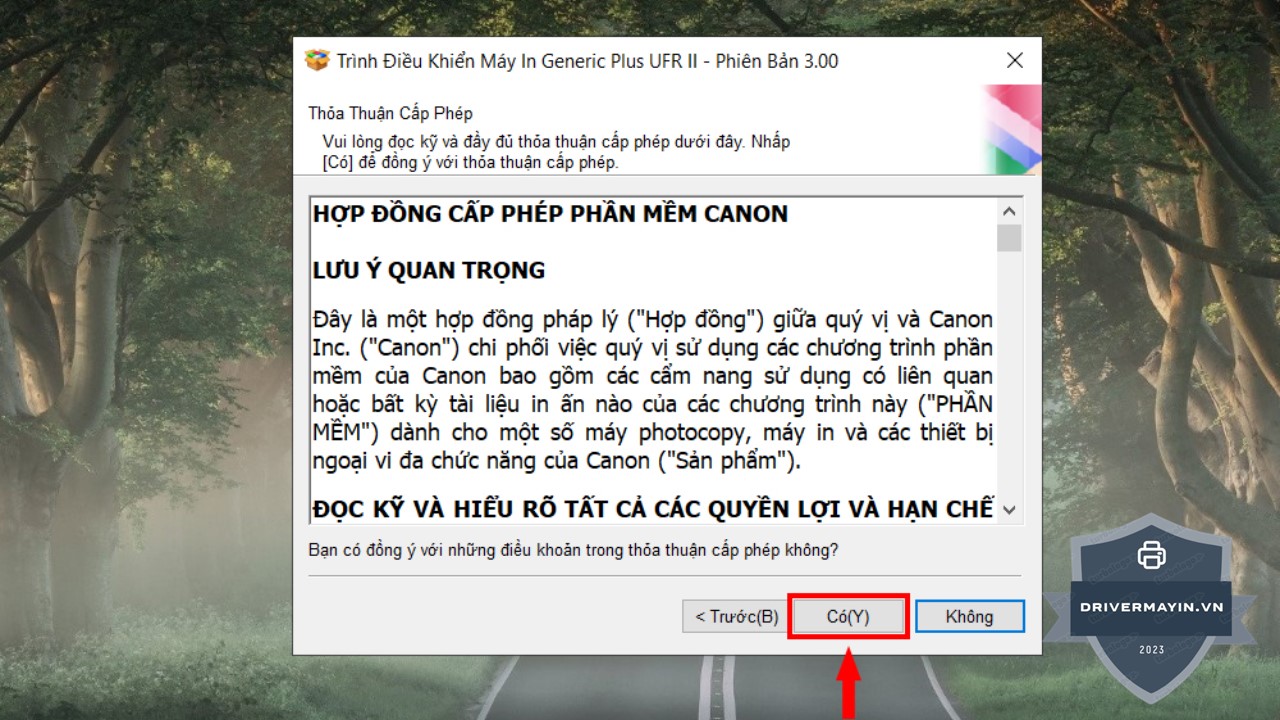 Một cửa sổ sẽ hiển thị các điều khoản của Canon. Chọn Có (Y) để đồng ý với các điều khoản và nhấn Next để tiếp tục.