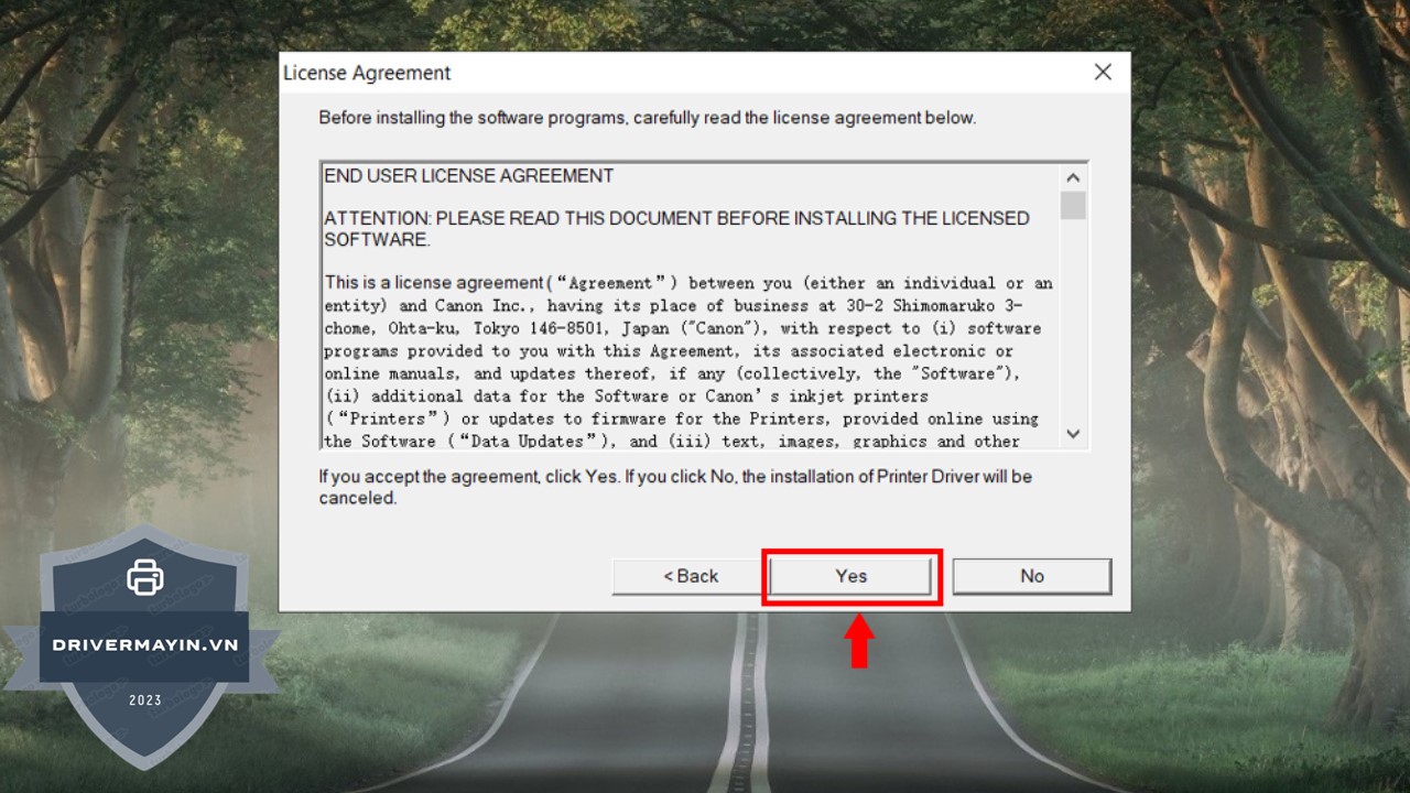 Bước 4: Đọc kỹ các điều khoản sử dụng của Canon, sau đó chọn Yes để đồng ý và tiếp tục cài đặt.