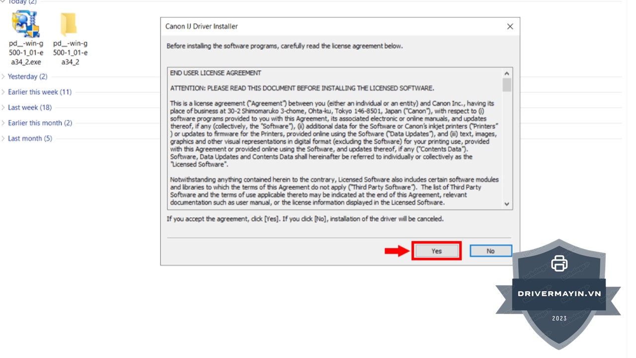 Bước 4: Đọc kỹ các điều khoản sử dụng của Canon, sau đó chọn Yes để đồng ý điều khoản và tiếp tục cài đặt.
