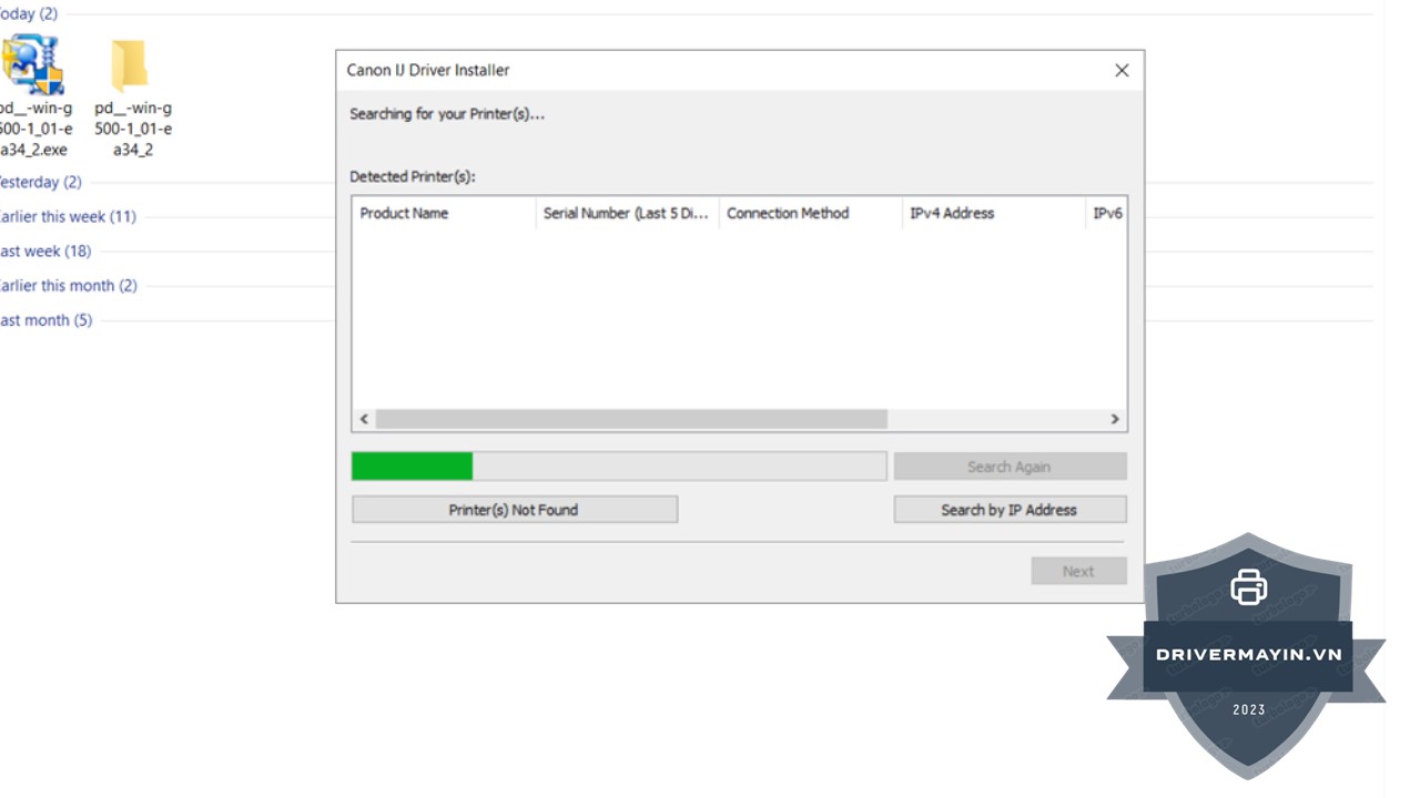 Bước 5: Hệ thống sẽ tự động dò tìm máy in. Bạn chọn đúng máy in Canon đang cần cài driver, rồi nhấn Next để tiến hành cài đặt.