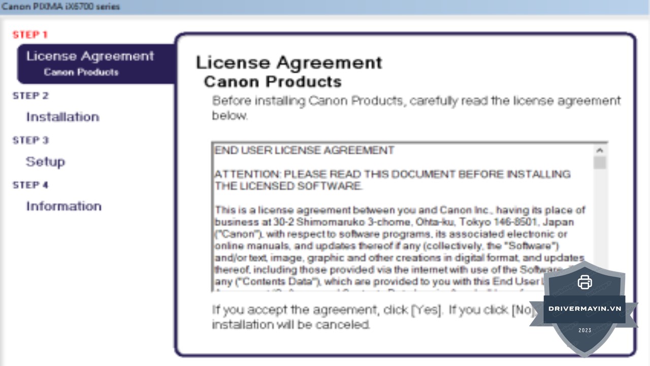 Bước 3: Tại mục License Agreement Canon Products, chọn Yes để đồng ý với các điều khoản sử dụng của Canon.