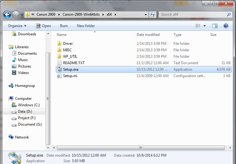 Mở thư mục vừa giải nén, nhấp đúp chuột vào file Setup.exe để bắt đầu quá trình cài đặt driver cho máy in Canon LBP 2900.