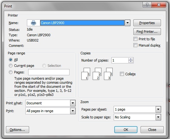 Sau khi máy tính khởi động xong, bạn hãy in thử một trang bất kỳ để kiểm tra. Trong hộp thoại Print, chọn Name: Canon LBP 2900, sau đó click OK.