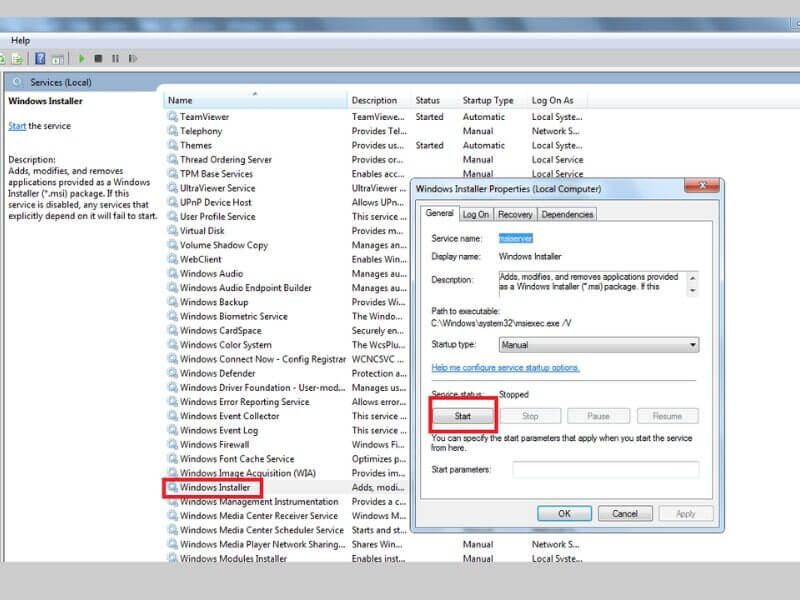 Trong danh sách dịch vụ, tìm Windows Installer, nhấp đúp chuột và chọn Start nếu dịch vụ chưa chạy.