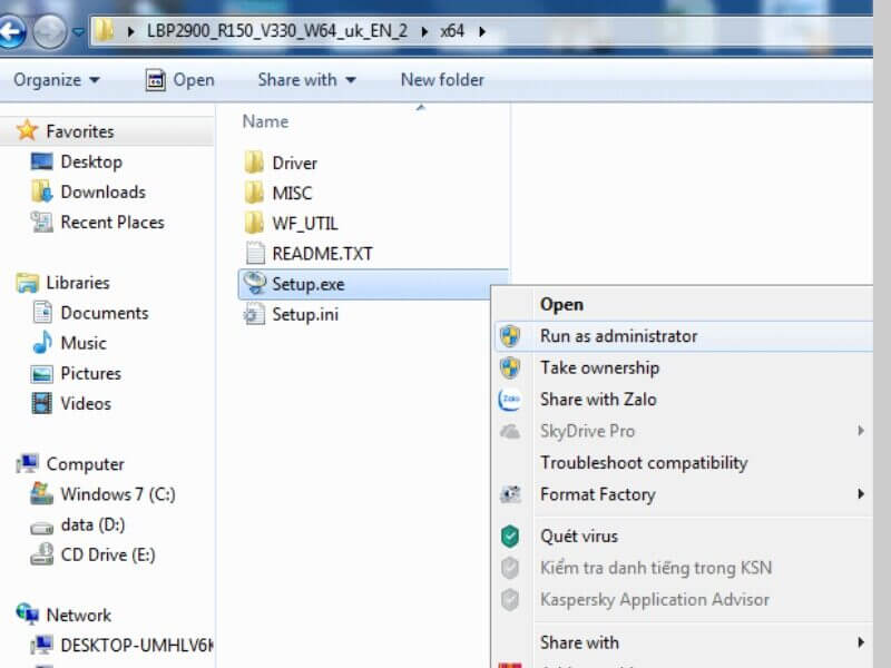 Quay lại thư mục driver Canon LBP 2900 đã tải về, nhấp chuột phải vào file setup.exe → chọn “Run as administrator” để tiến hành cài đặt lại driver trên Windows.