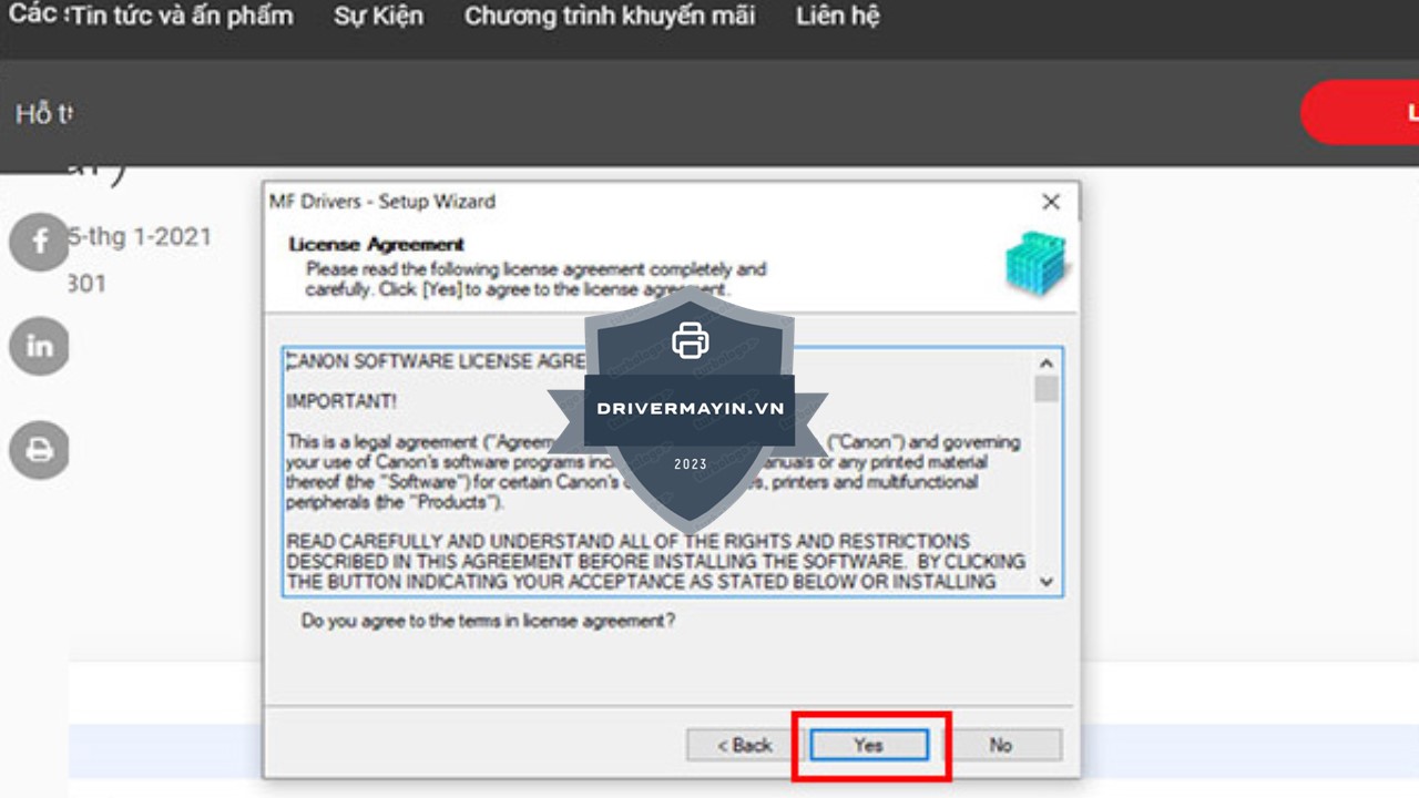 Tiếp theo, chọn Yes để đồng ý các điều khoản sử dụng. Hệ thống sẽ tự động sao chép các file cài đặt vào máy tính. Khi quá trình này hoàn tất, màn hình sẽ hiển thị thông báo yêu cầu bạn kết nối cáp USB với máy in.