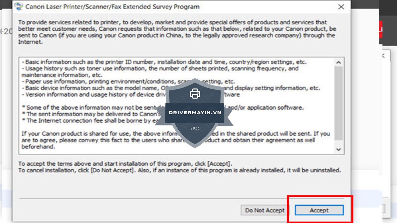 Tiến hành cắm cáp USB giữa máy in Canon MF3010 và máy tính, sau đó chọn Accept và nhấn Next. Chờ đến khi màn hình hiển thị thông báo “Driver Canon MF3010 Installation Complete” là quá trình cài đặt đã thành công.