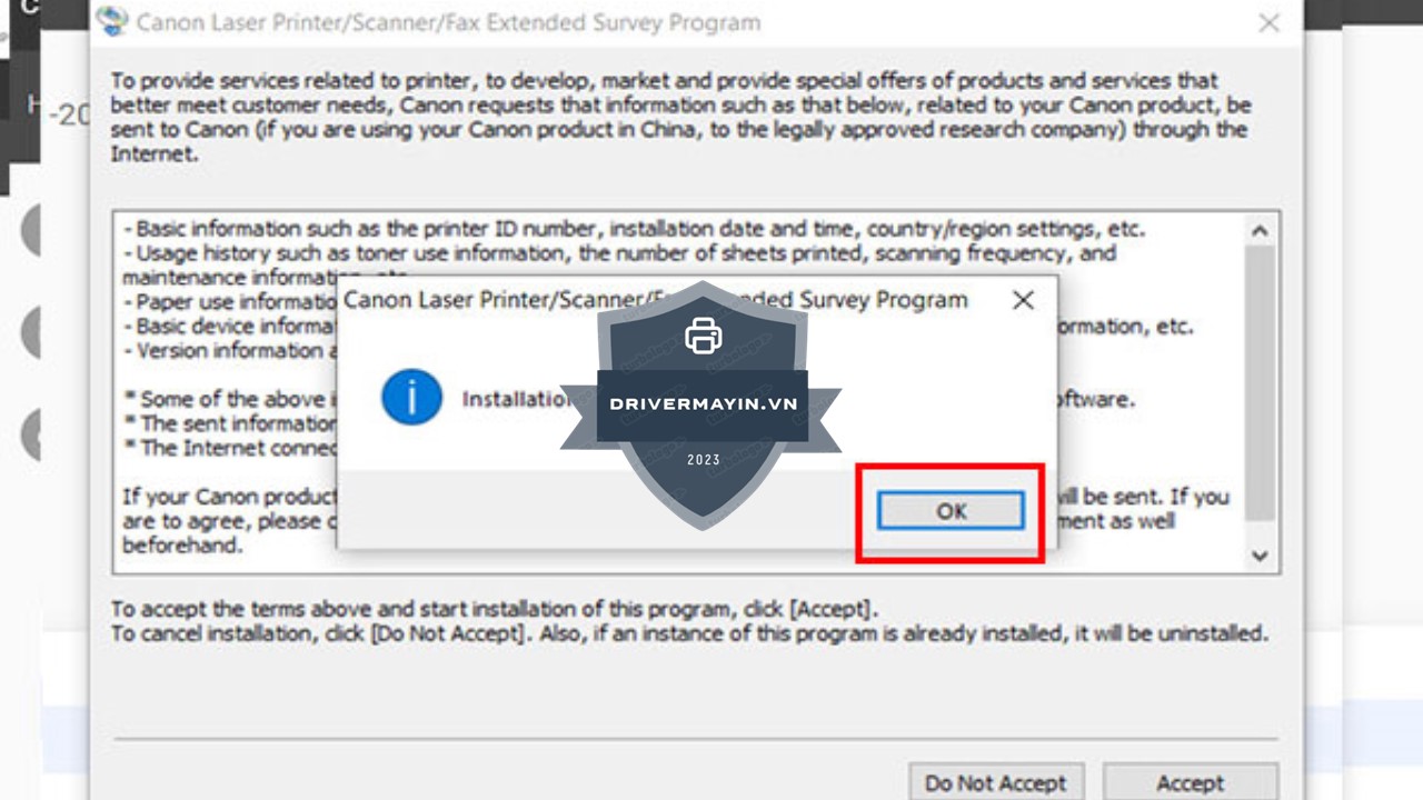 Cuối cùng, nhấn OK để kết thúc quá trình tải và cài đặt Driver máy in Canon MF3010. Bạn có thể tiến hành in test để kiểm tra và bắt đầu sử dụng máy in như bình thường.