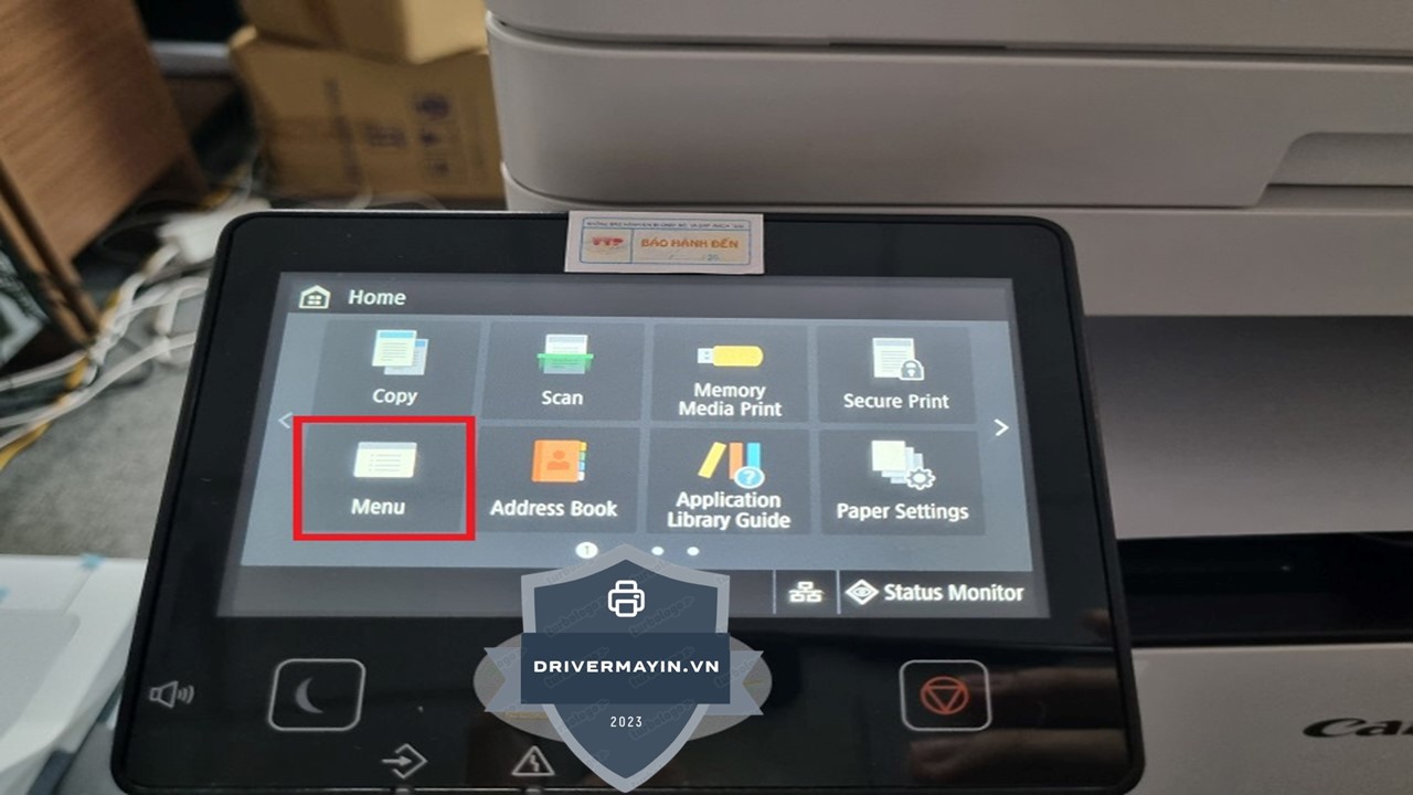 Nhấn nút Nguồn (Power) để bật máy in Canon MF462DW. Khi màn hình hiển thị giao diện chính, bạn nhấn chọn nút “Menu” trên bảng điều khiển để bắt đầu thiết lập.