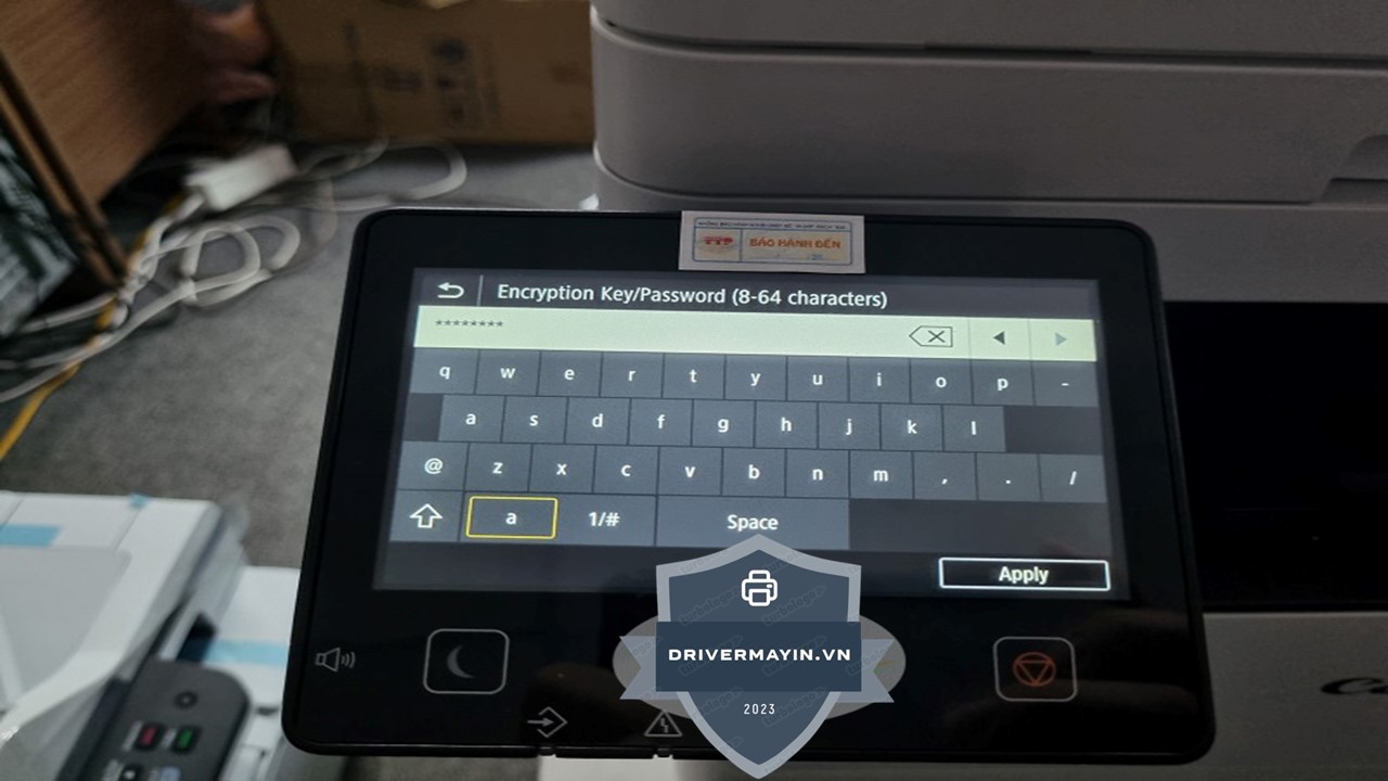 Tại màn hình “Encryption Key / Password (8–64 characters)”, bạn tiến hành nhập mật khẩu WiFi tương ứng. Lưu ý nhập đúng chữ hoa, chữ thường và ký tự đặc biệt (nếu có), sau đó chọn “Apply” để xác nhận.