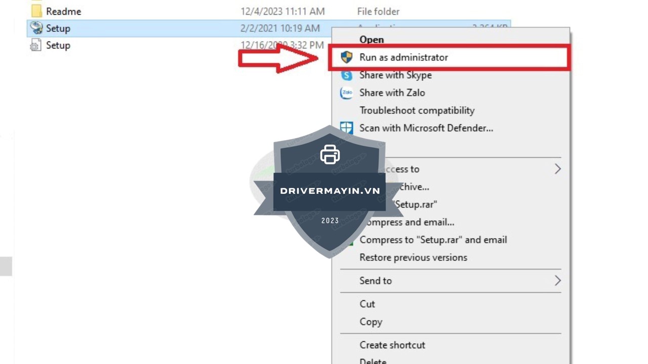 Mở thư mục vừa giải nén, tìm file “Setup.exe”. Nhấn chuột phải vào file Setup và chọn “Run as administrator” để đảm bảo Driver được cài đặt đầy đủ quyền hệ thống.