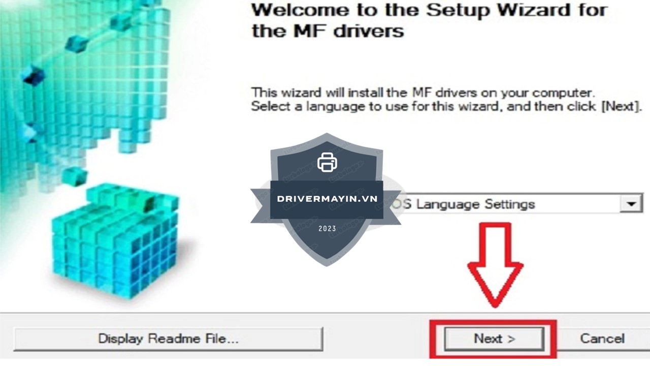 Khi cửa sổ cài đặt Driver Canon MF462DW xuất hiện, bạn chọn ngôn ngữ English (hoặc ngôn ngữ mong muốn nếu có), sau đó nhấn “Next” để tiếp tục.