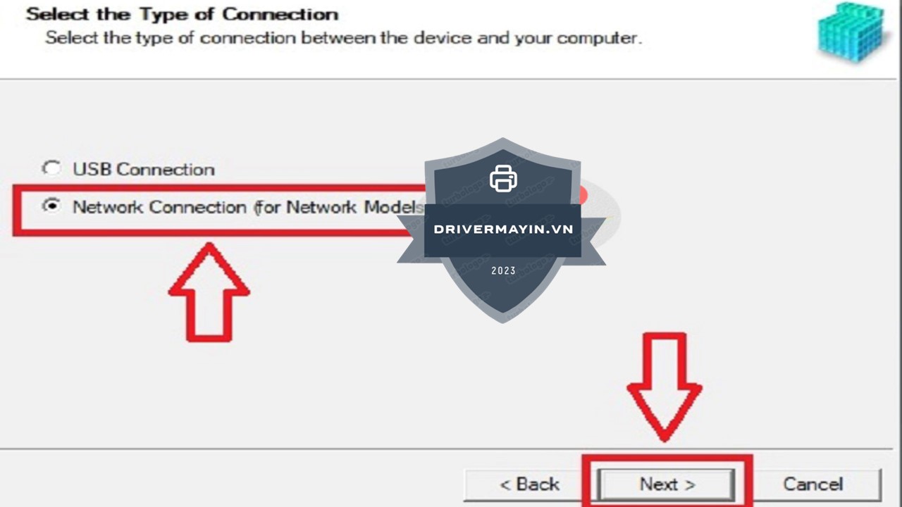 Do máy in Canon MF462DW đã được kết nối WiFi từ trước, bạn hãy chọn “Network Connection”, sau đó nhấn “Next”.