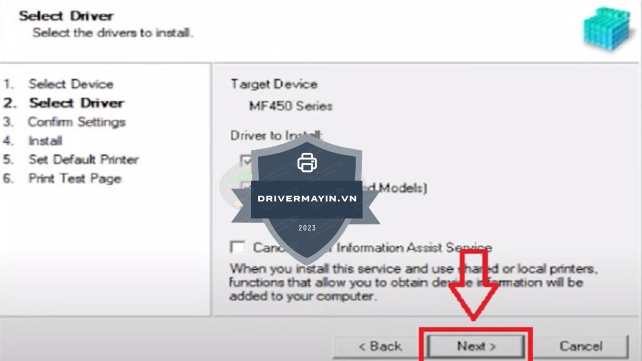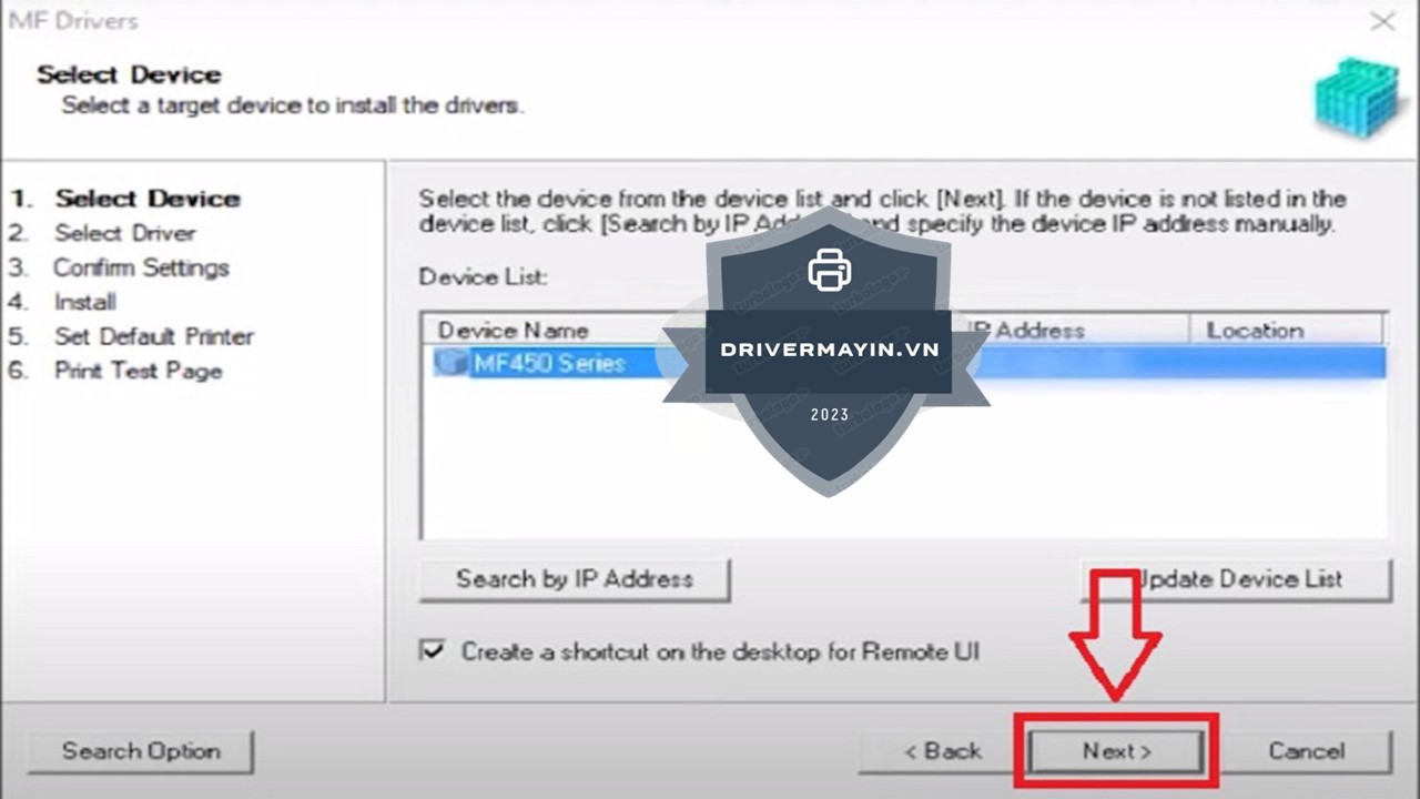 Hệ thống sẽ tự động dò tìm và hiển thị tên máy in Canon MF460 Series kèm theo địa chỉ IP đã kết nối mạng. Bạn kiểm tra lại thông tin, sau đó nhấn “Next” để xác nhận.