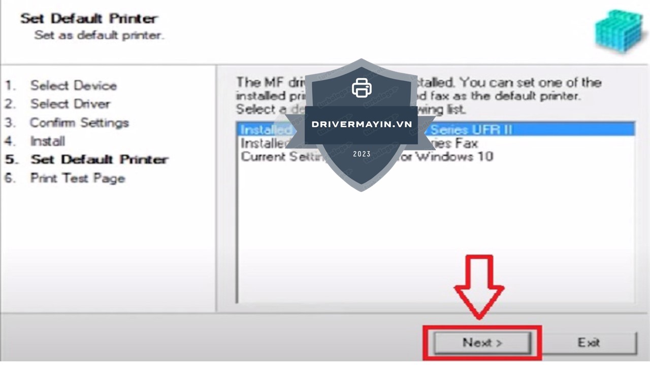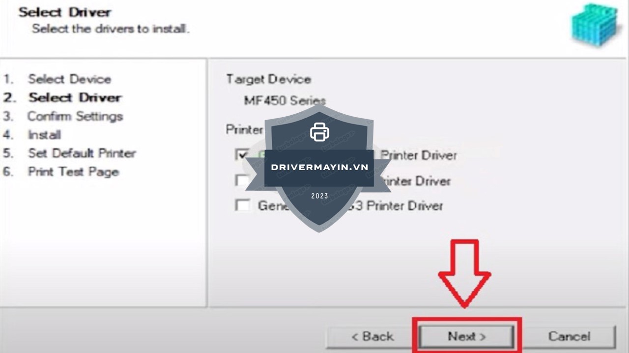Ở bước này, bạn giữ nguyên tùy chọn mặc định là “Generic Plus UFR II Printer Driver”. Sau đó nhấn “Next” để chuyển sang bước tiếp theo.