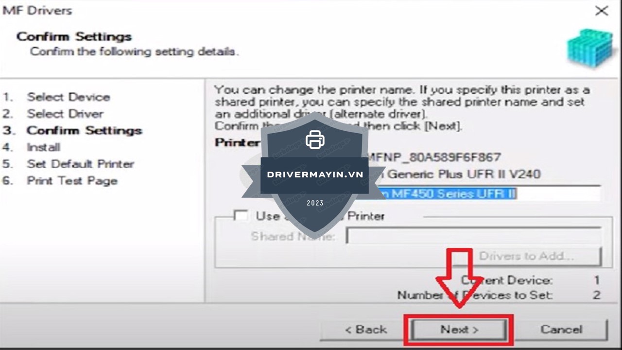 Bạn có thể đổi tên máy in theo ý muốn (ví dụ: Canon MF462DW Văn Phòng, Canon 462DW WiFi…) để dễ nhận biết khi sử dụng nhiều máy in. Nhấn “Next” để xác nhận.