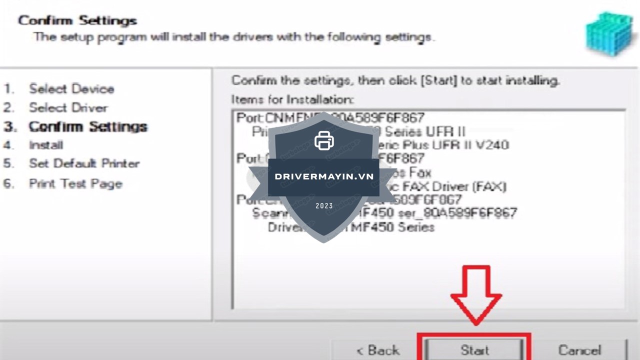 Nhấn “Start” để hệ thống bắt đầu quá trình cài đặt Driver Canon MF462DW. Quá trình này sẽ diễn ra tự động, bạn chỉ cần chờ trong vài phút.