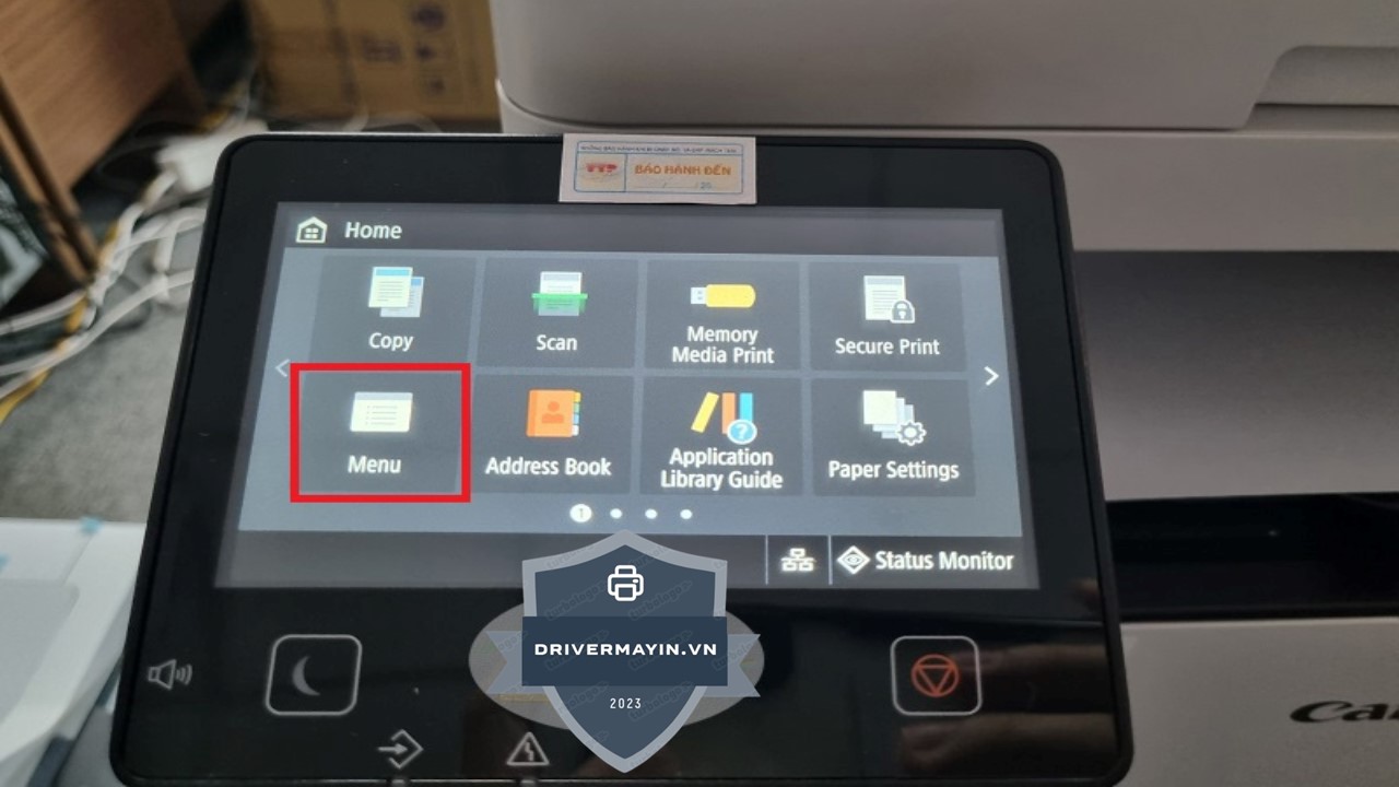 Khởi động máy in Canon MF462DW, tại màn hình chính, bạn nhấn chọn Menu để bắt đầu quá trình cài đặt.