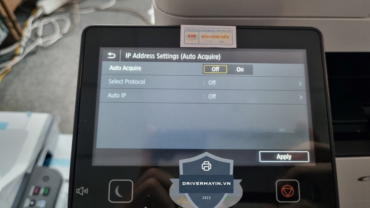 Sau khi chuyển sang OFF, nhấn Apply để lưu cài đặt, sau đó nhấn OK để xác nhận. Việc tắt các tùy chọn này giúp máy in không tự động nhận IP mới khi mạng thay đổi.