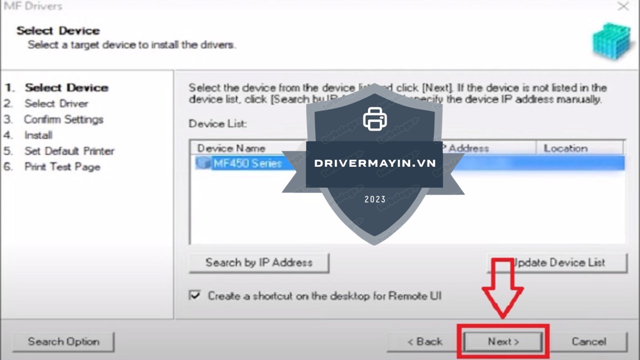 Hộp thoại tiếp theo sẽ hiển thị tên máy in Canon MF460 Series kèm theo địa chỉ IP đã kết nối trong mạng. Bạn kiểm tra lại thông tin, sau đó nhấn “Next”.