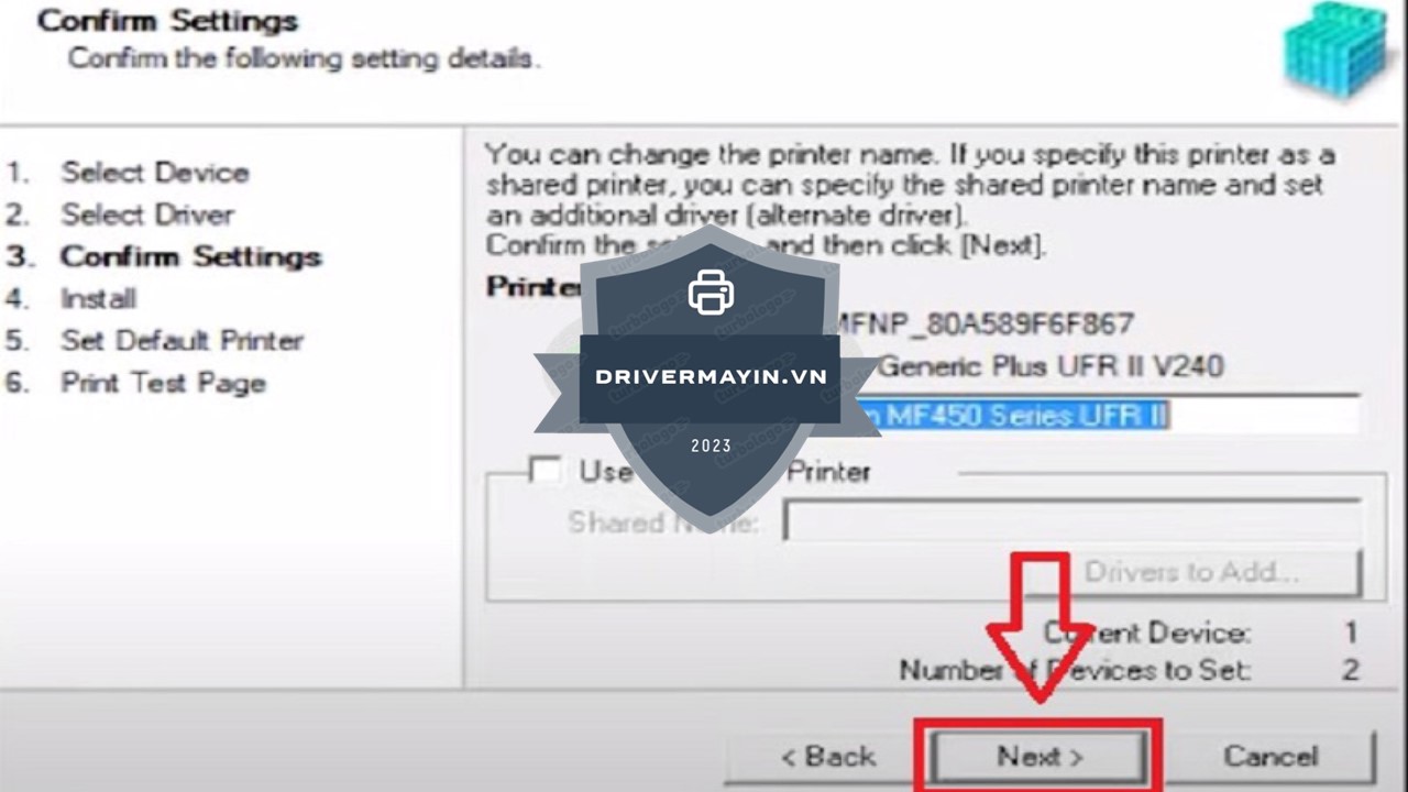 Tại bước này, bạn có thể tùy chỉnh tên máy in theo ý muốn để dễ nhận biết trong hệ thống (ví dụ: Canon MF462DW – Phòng Kế Toán). Sau đó nhấn “Next”.
