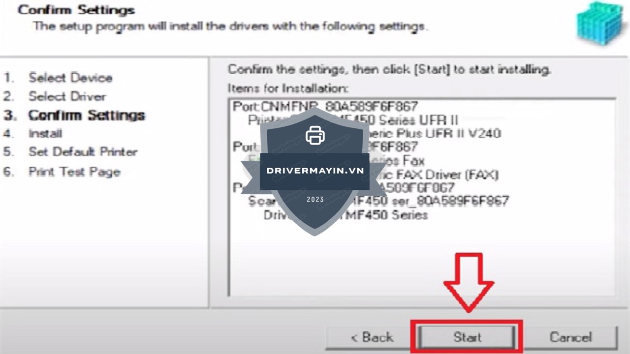 Nhấn “Start” để hệ thống bắt đầu tiến trình cài đặt driver máy in Canon MF462DW.