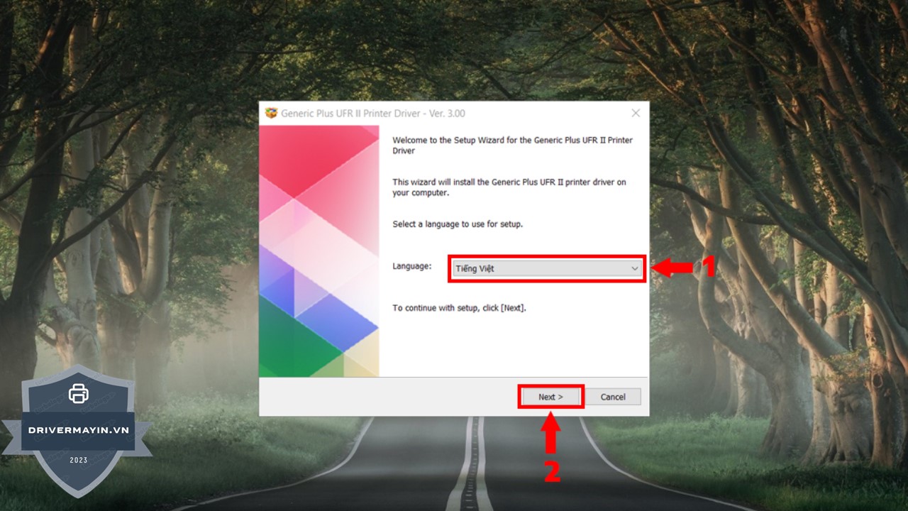 Tại giao diện đầu tiên, bạn hãy lựa chọn ngôn ngữ Tiếng Việt để thuận tiện theo dõi các hướng dẫn cài đặt. Sau đó nhấn Next để tiếp tục quá trình cài đặt driver.