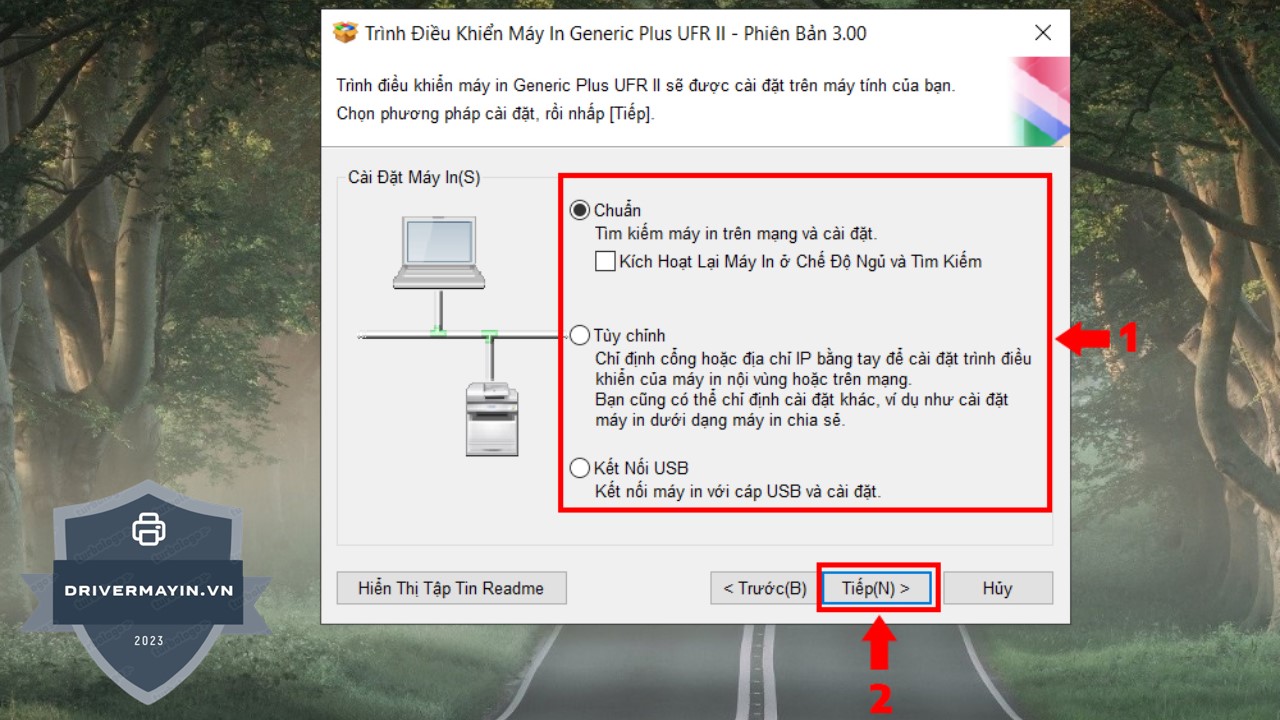 Canon MF655CDW hỗ trợ nhiều hình thức kết nối như USB, mạng LAN hoặc WiFi. Tại bước này, bạn hãy chọn phương thức kết nối đang sử dụng, sau đó nhấn Tiếp (N) để hệ thống thiết lập kết nối chính xác giữa máy tính và máy in.
