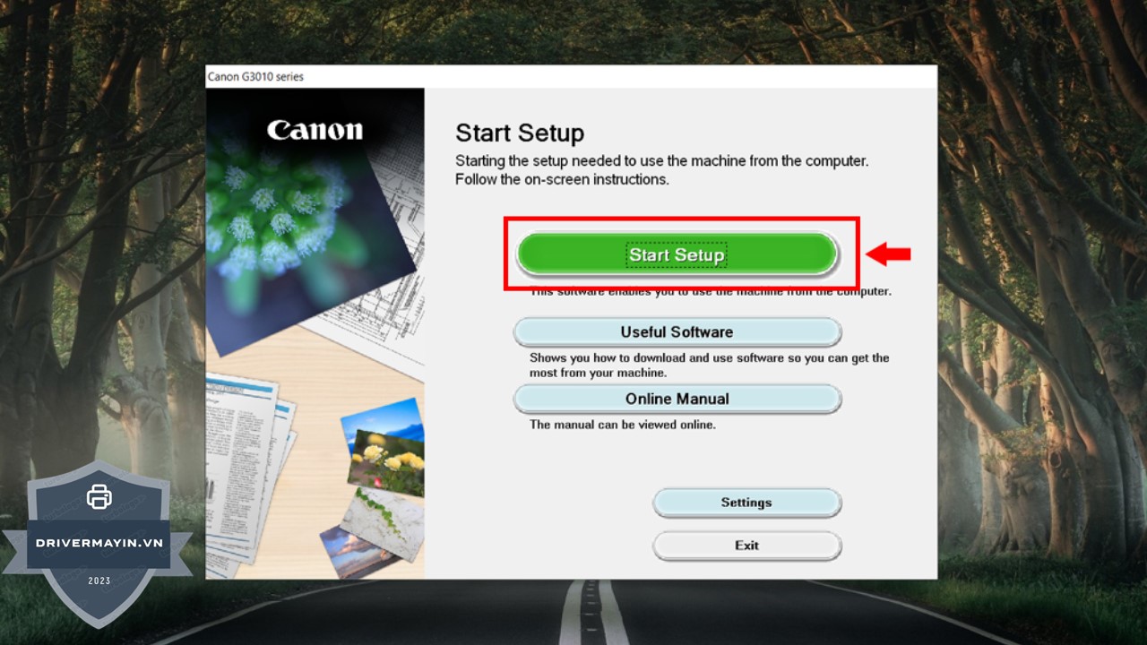 Khi giao diện cài đặt xuất hiện, bạn chọn Start Setup để hệ thống tiến hành thiết lập driver cho máy in.