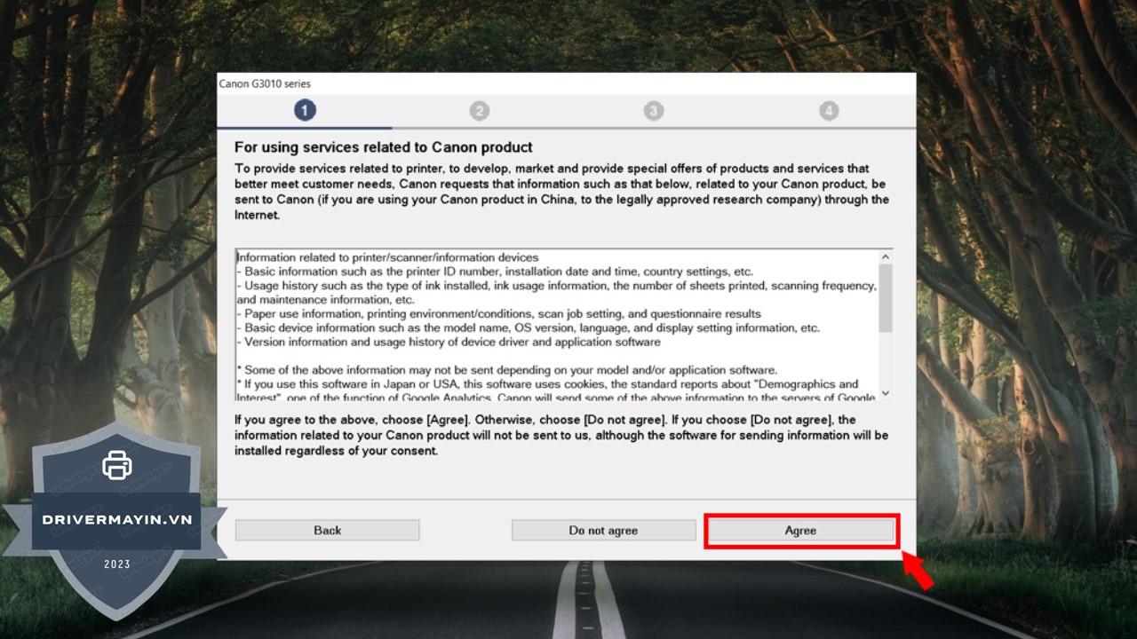 Tiếp theo, bạn cần đồng ý với các điều khoản của Canon bằng cách chọn Agree để chuyển sang bước tiếp theo.