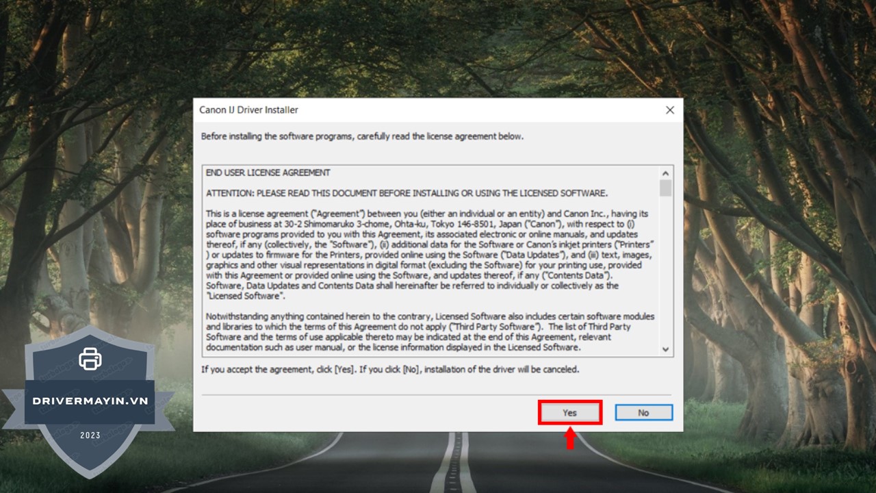 Bước 4: Đọc kỹ các điều khoản sử dụng của Canon và nhấn Yes để đồng ý, cho phép tiếp tục cài đặt driver máy in.
