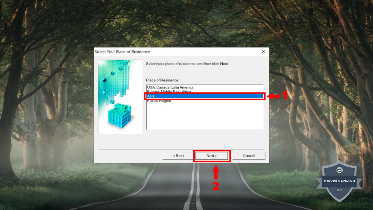Bước 3: Ở phần lựa chọn khu vực, bạn chọn Asia, sau đó nhấn Next để đảm bảo driver phù hợp với khu vực sử dụng.
