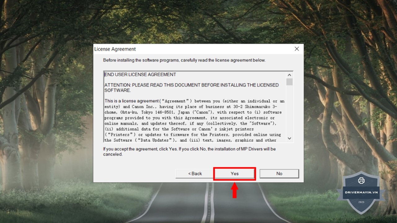 Bước 4: Hệ thống sẽ hiển thị các điều khoản sử dụng của Canon. Tại đây, bạn chọn Yes để đồng ý và tiếp tục quá trình cài đặt driver.
