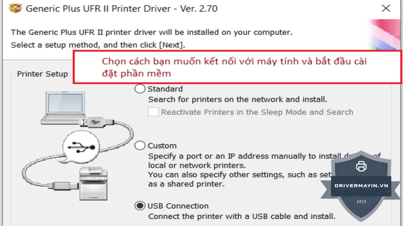 Tiếp theo, hệ thống sẽ yêu cầu bạn chọn cách kết nối thiết bị với máy tính (USB hoặc Network tùy cấu hình máy). Sau khi chọn xong, nhấn Next để bắt đầu cài đặt driver tự động.