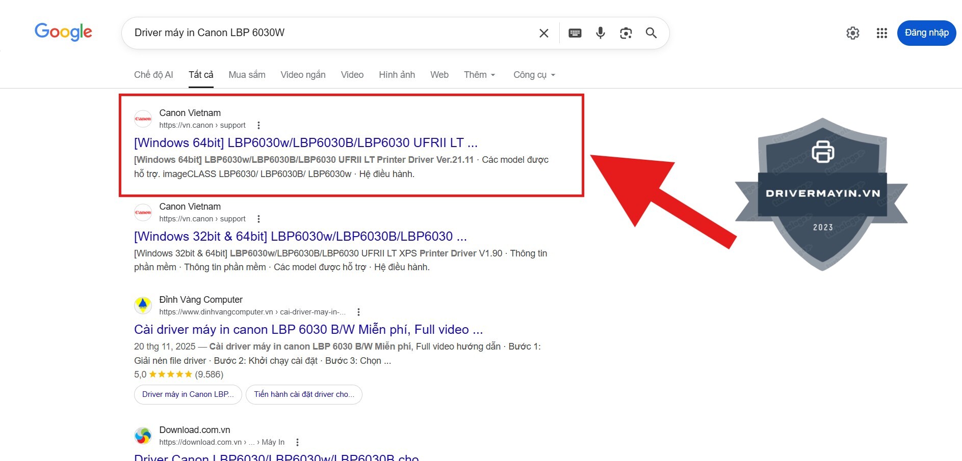 Trong danh sách kết quả hiển thị, bạn hãy chọn website có tên miền https://vn.canon/.... Đây là trang web chính thức của Canon Việt Nam, nơi cung cấp Driver và tài liệu hỗ trợ cho các dòng máy in Canon, bao gồm cả Canon LBP 6030W. Sau khi xác định đúng website, bạn nhấp chuột để truy cập vào website tải.