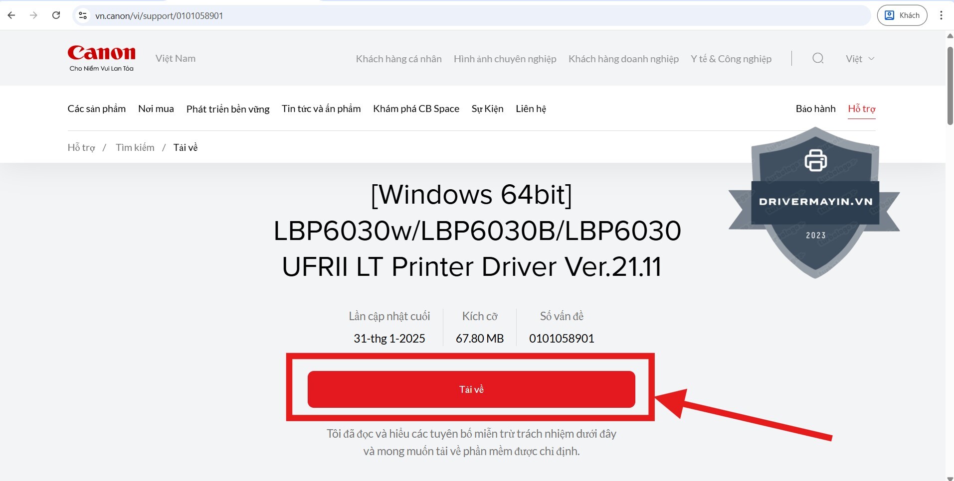 Để đảm bảo tải đúng Driver máy in Canon LBP 6030W chính hãng, hạn chế tối đa lỗi trong quá trình cài đặt, quý khách nên tải Driver trực tiếp từ website chính thức của Canon Việt Nam. Dưới đây là các bước thực hiện chi tiết dành cho cả người mới sử dụng: