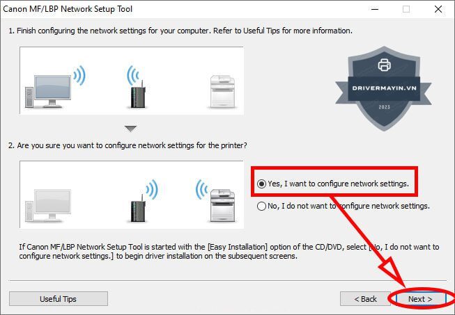 Hệ thống sẽ hỏi xác nhận cài đặt Network: Chọn Yes, I want to... để đồng ý. Nhấn Next để tiếp tục.