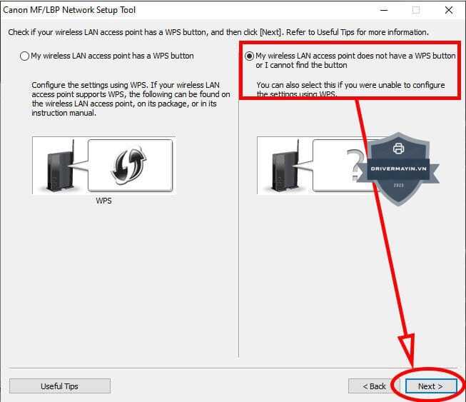 Ở bước này, bạn chọn đúng hạng mục “My wireless LAN access point does not have a WPS button or I cannot find the button” hiển thị trên màn hình và nhấn Next.